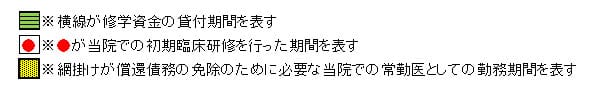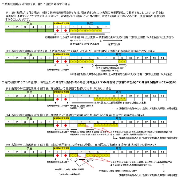 初期臨床研修及び専門医研修修了後、直ちに当院の常勤の医師として勤務した月数が、貸付期間の月数に達したとき償還債務が免除されます。(条例第11条第1項)