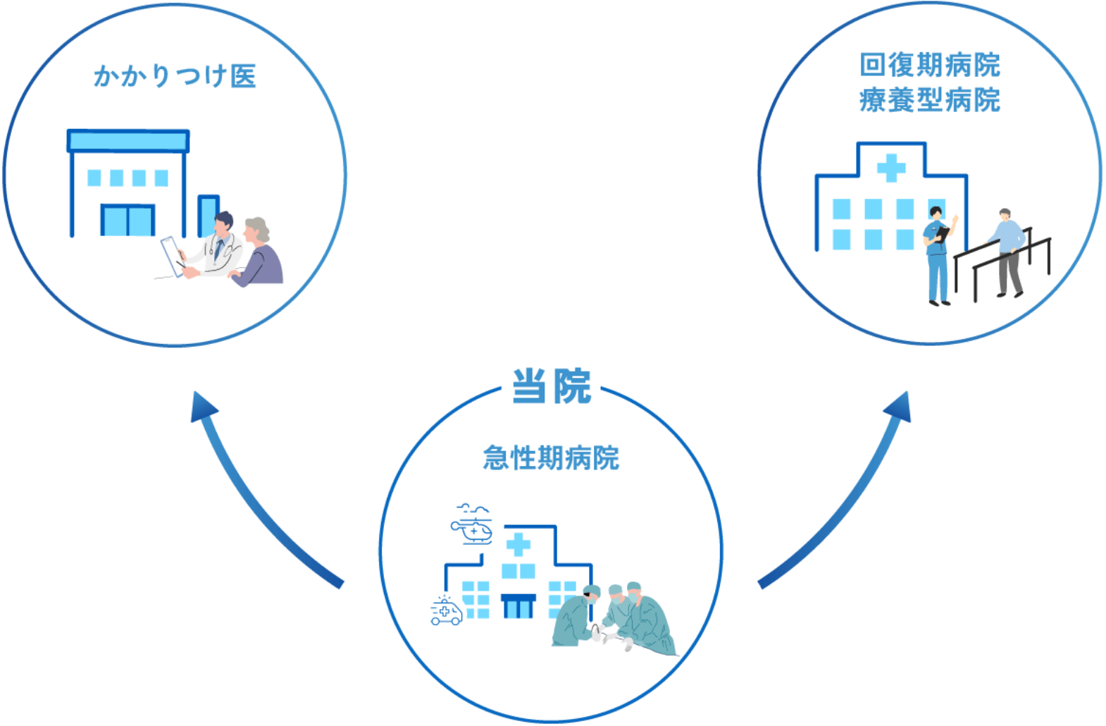 当院は急性期病院であり、入院治療を必要とする救急患者を受け入れ、手術や精密な検査など高度で専門的な医療を24時間365日提供しています。そのため、急性期を経過し、症状が安定された場合、かかりつけ医への紹介や回復期リハビリテーション病棟や療養型病院などへの転院をお願いしています。