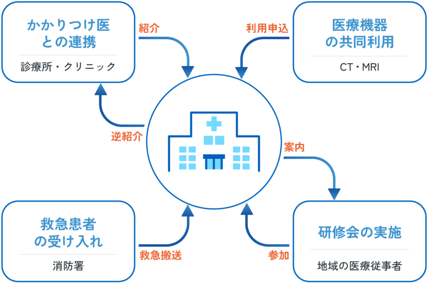 地域医療支援病院とは、地域の病院・診療所の医師から、より詳しい検査や、専門的な医療が必要と紹介された患者さんに対して、適切な医療を提供することを目的とした病院です。