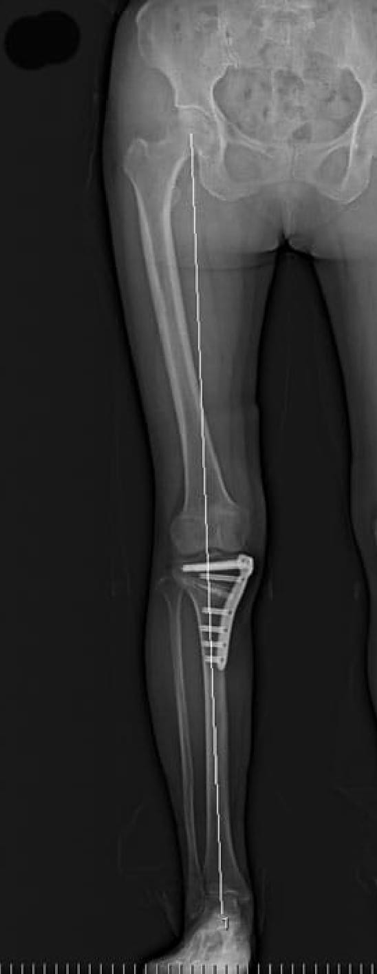 骨入り術は脛骨(すねの骨)の一部分に切れ目をいれて、あいだを広げ、O脚となっている脚を軽度のX脚に矯正した状態で、プレートで固定する手術です。痛みの原因になっている箇所にかかる体重を他の箇所に変えることで、痛みがとれ、また痛んだ軟骨が再生することも知られています。